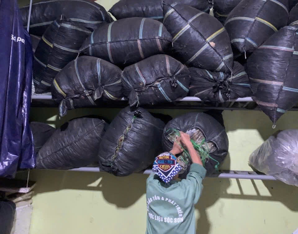 18-09-2025 12:09:00 | Nhà kho bảo quản | Nhập kho tổng khối lượng thu hoạch lá Trà hoa vàng sau các đợt thu hoạch là: 19 (Kg). Lá trà được đóng trong bao nilon trong suốt và đựng trong bao tải dứa rồi xếp lên giá riêng biệt trong kho chứa dược liệu. | Hoàn thành |