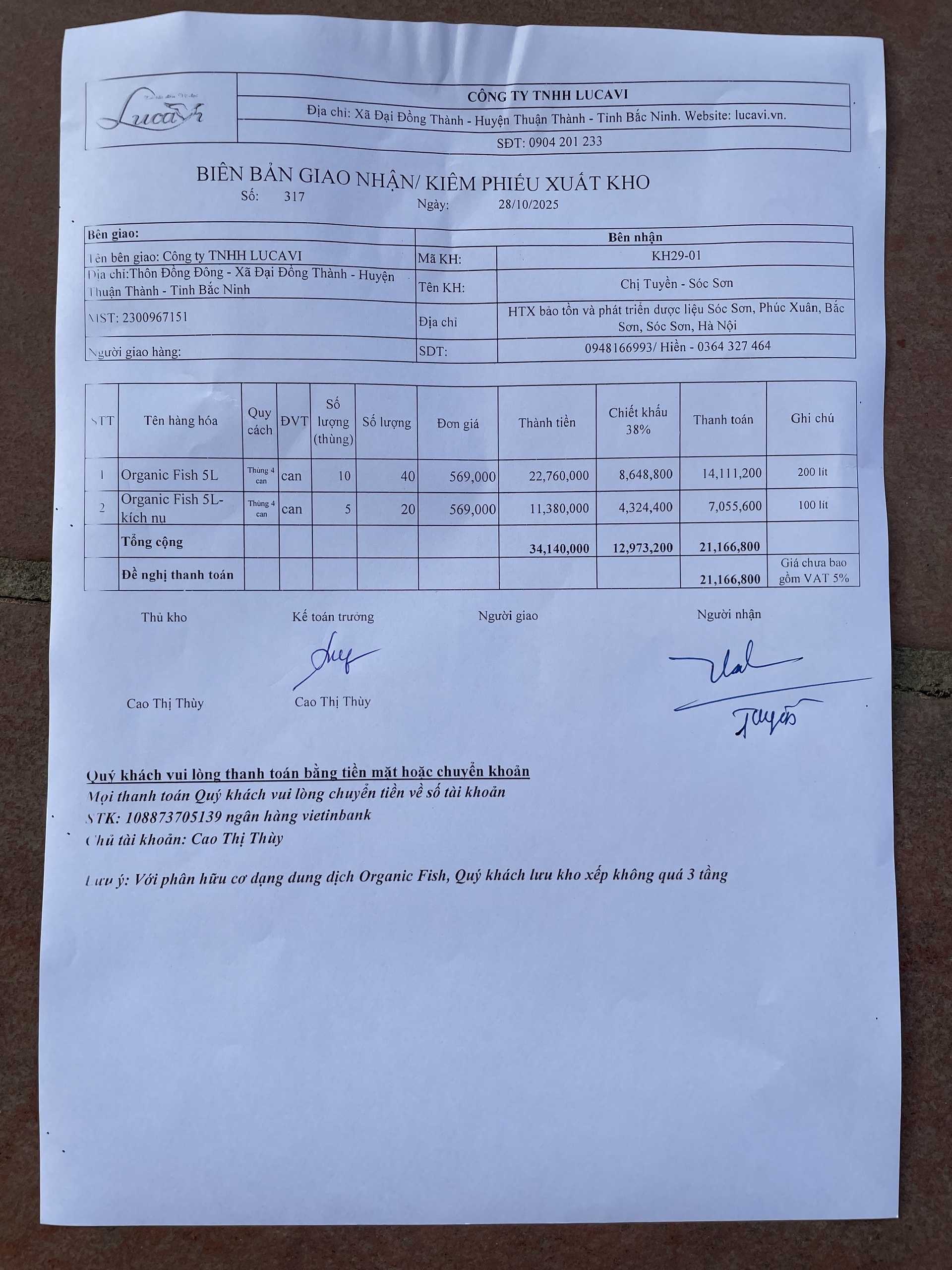 28-10-2025 12:10:00 Phân hữu cơ Nhập kho phân bón hữu cơ Lucavi. Khu 3 nhập kho 5 thùng phân Organic Fish (Thùng 4 chai 5L) tổng 100 Lít và 3 thùng Organic Fish kích nụ (Thùng 4 chai 5L) tổng 60 Lít. Hoàn thành