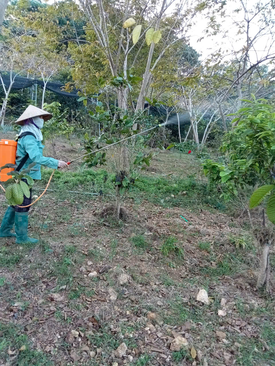 27-10-2025 12:10:00 Phòng trừ bệnh Tiến hành phun chế phẩm sinh học trừ sâu thảo mộc kết hợp Anisaf 01, 02 và 03. Cách dùng: pha tỉ lệ 80ml mỗi loại chế phẩm pha chung với bình 20 lít nước, tiến hành pha và phun cho toàn bộ vườn. Tổng 6 bình phun. Hoàn thành