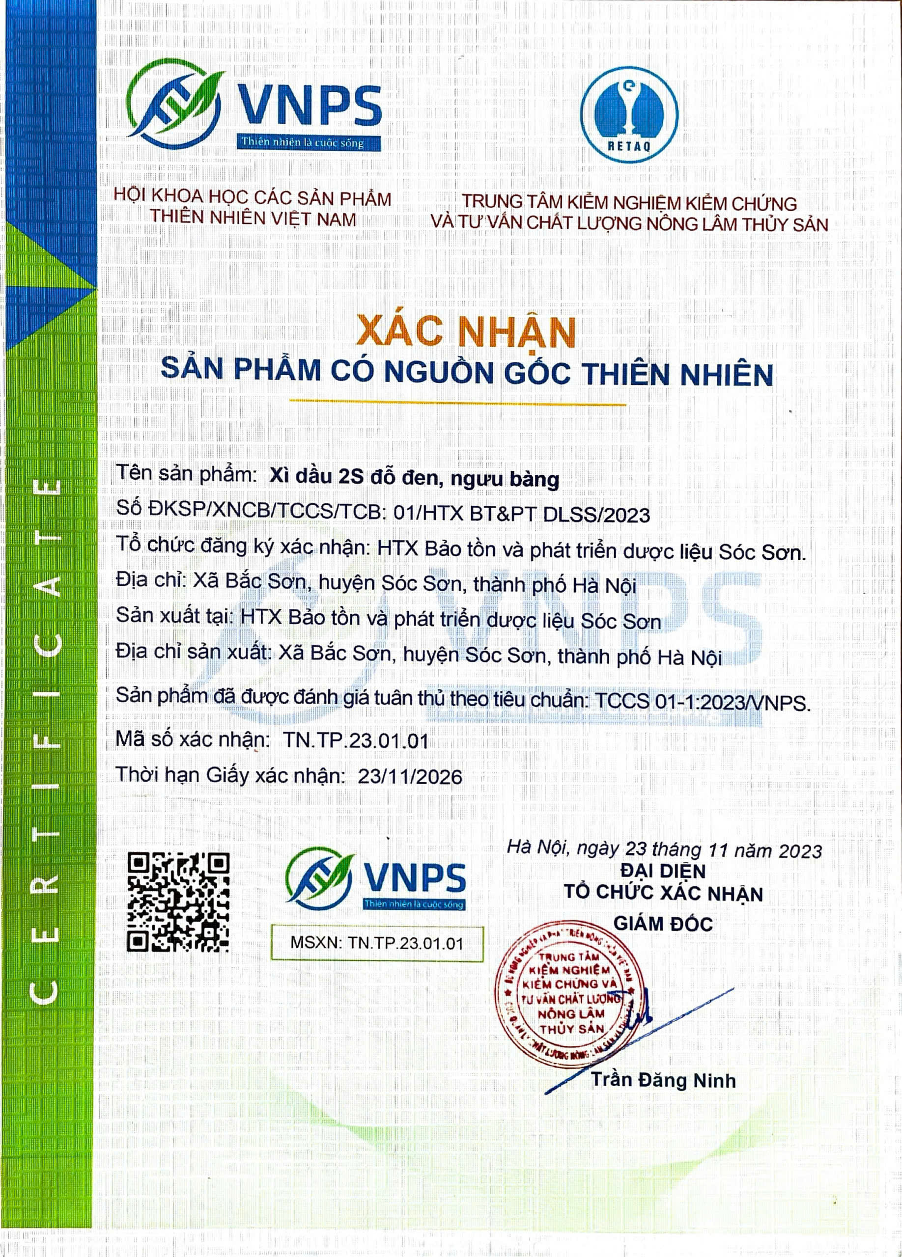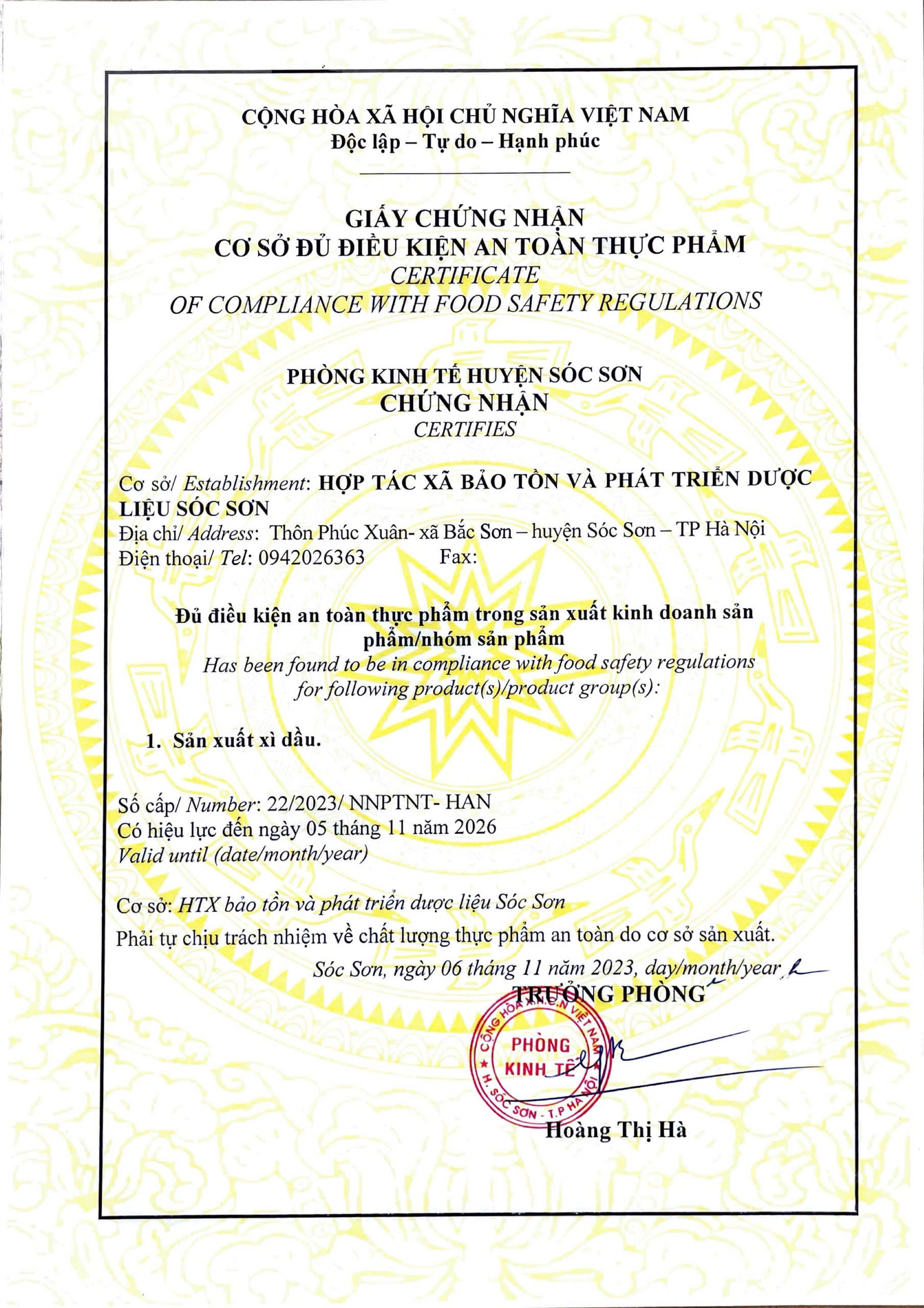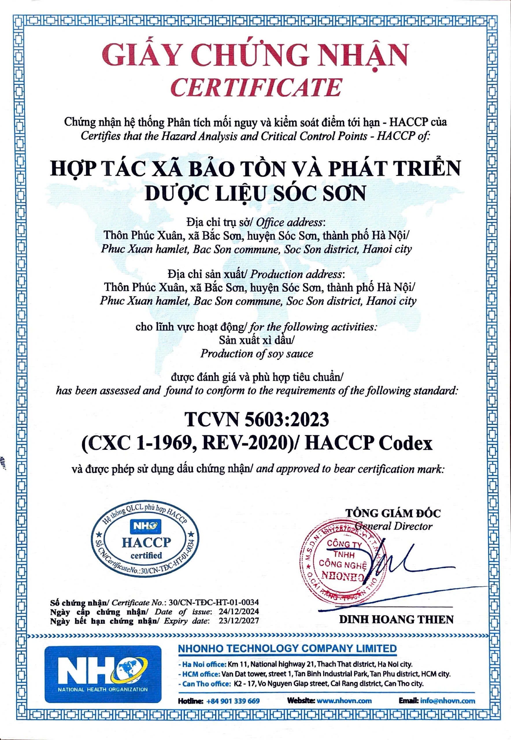 01-07-2025 12:07:00 Giấy chứng nhận Sản phẩm Xì dầu 2S Đỗ đen - Ngưu bàng đạt Chứng nhận HACCP - Hệ thống phân tích mối nguy và kiểm soát điểm tới hạn. Chứng nhận Sản phẩm có nguồn gốc Thiên nhiên, Chứng nhận ATVSTP. Hoàn thành